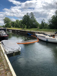 An der Einsatzstelle waren ölhaltige Betriebsmittel aus einem Boot ausgetreten und ins Hafenbecken gelangt. Ein weiteres ausbreiten des Ölfilms wurde mit einer Ölsperre verhindert. Der Ölfilm wurde mit Ölbindevlies aufgenommen.
