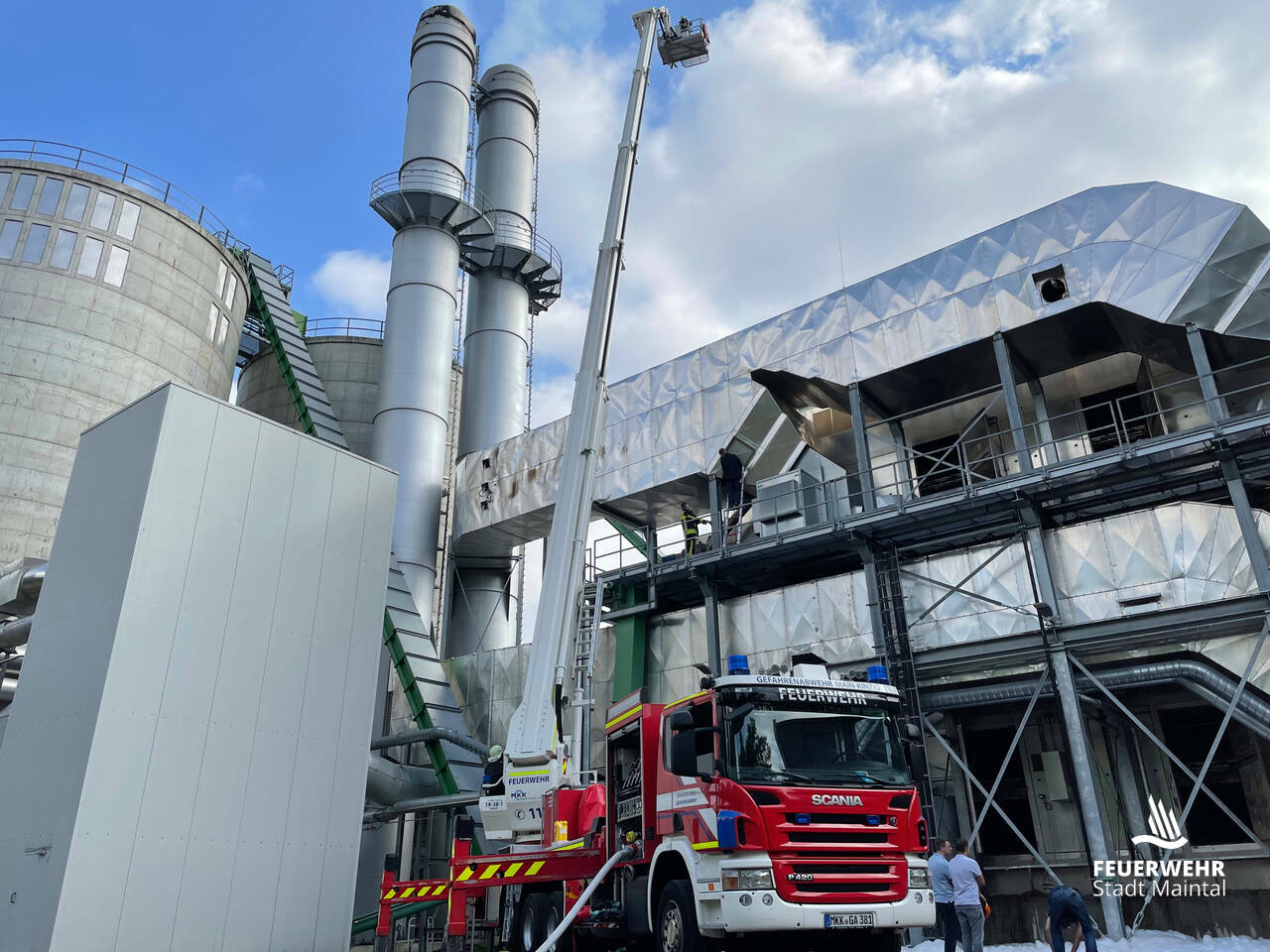 Der Teleskopgelenkmast unterstützt die Offenbacher Einsatzkräfte bei den Löscharbeiten in einem Pelletwerk.