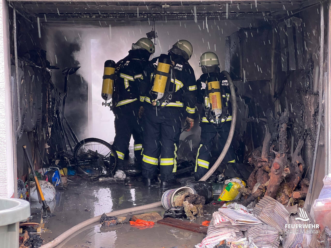 An der Einsatzstelle brannte es in einer Garage. Das Feuer wurde durch zwei Trupps unter Atemschutz mit einem Strahlrohr gelöscht.